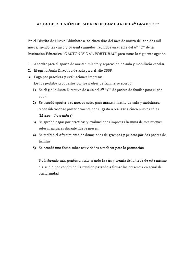 Modelo De Acta De Reunion De Padres De Familia Muestras De