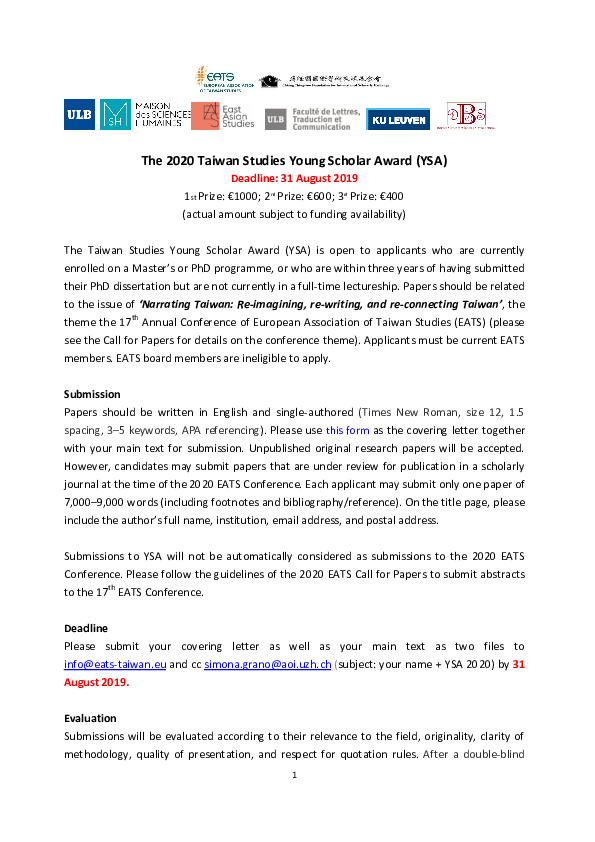 Pdf Call For Papers The 2020 Taiwan Studies Young Scholar Award