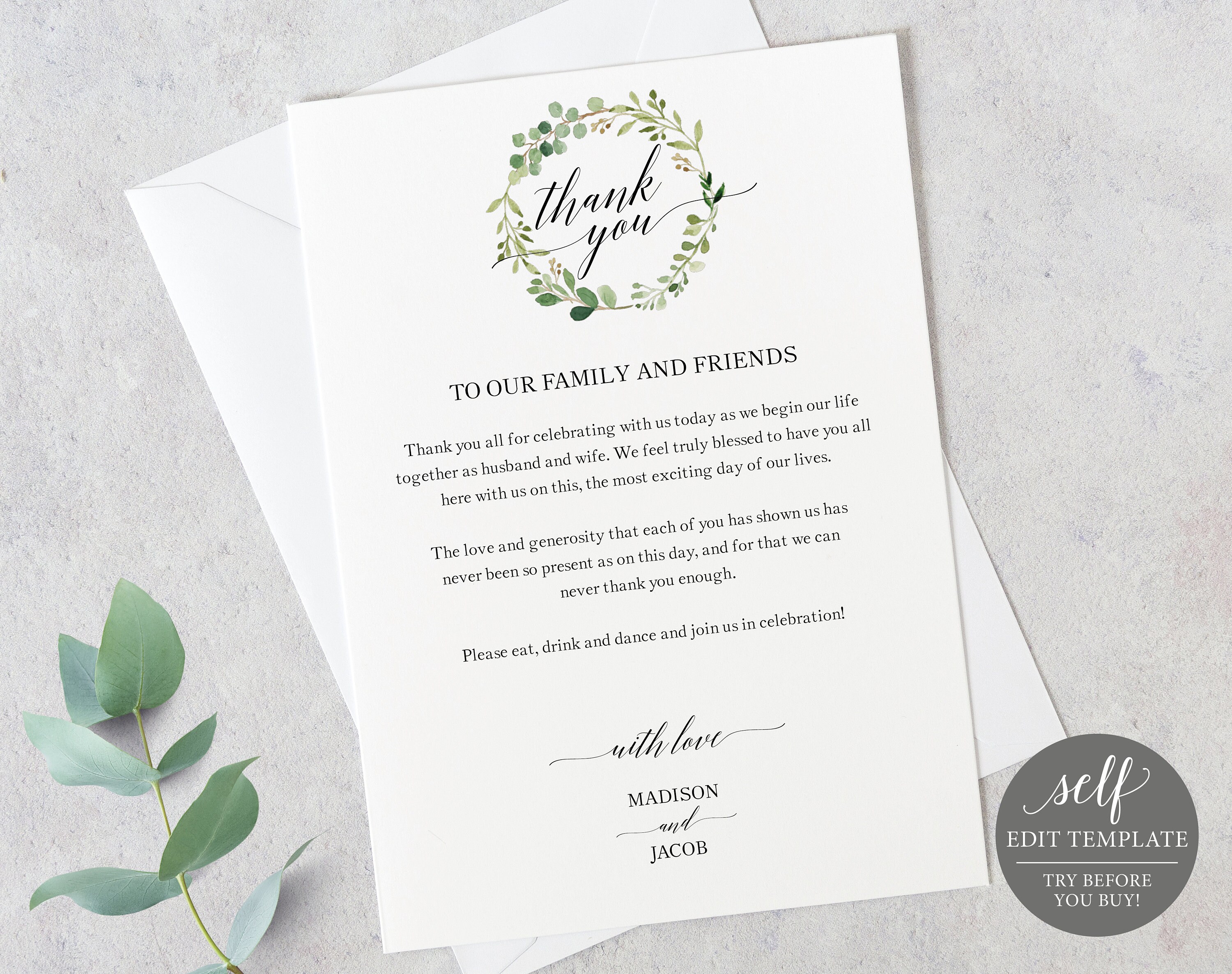 Greenery Wedding Thank You Card Template Printable Thank You Card